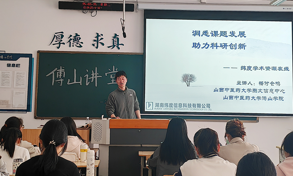 3月25日上午,tyc41183太阳成集团在图文信息中心906教室举办“傅山讲堂”系列学术讲座第七十二期。湖南纬度信息科技有限公司产品经理杨付仓鸣以《洞悉课题发展 助力科研创新——纬度学术资源在线数据库介绍》为题展开分享。